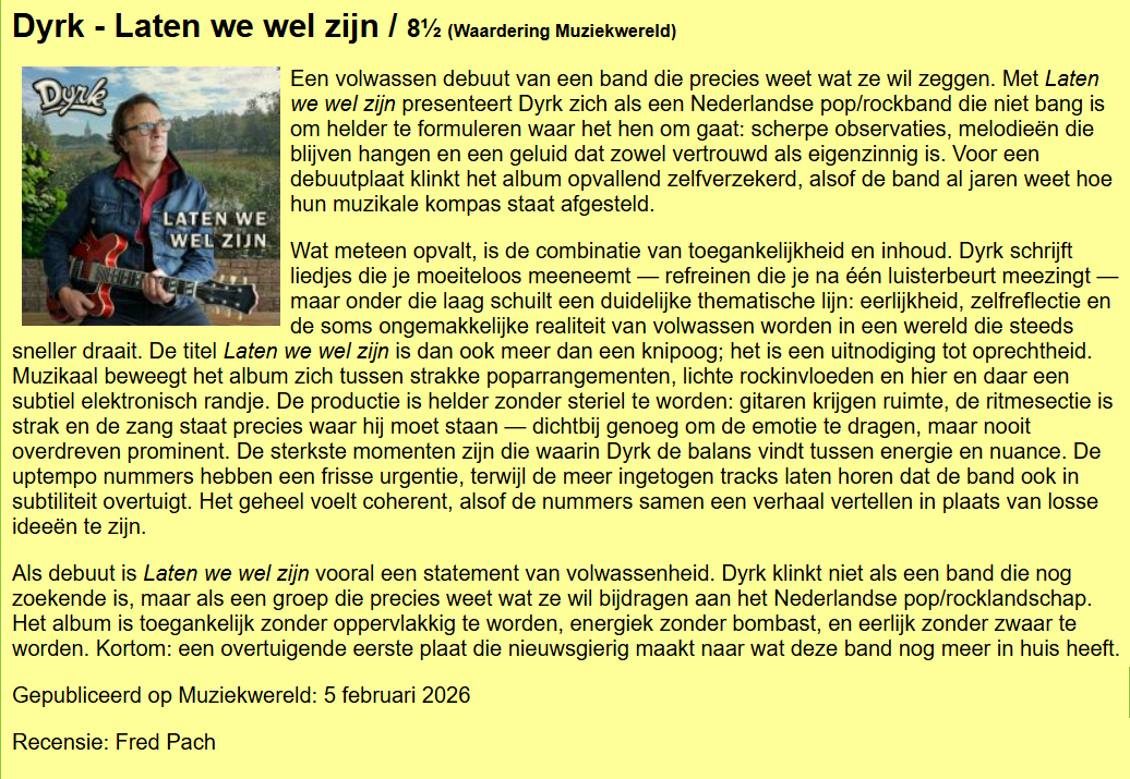 De eerste recensie is binnen, en wat voor een! Fred Pach van Muziekwereld heeft debuutalbum Laten we wel zijn van Dyrk beluisterd en beoordeeld en het resultaat is alles waar we op hadden kunnen hopen! Hier doen we het voor.